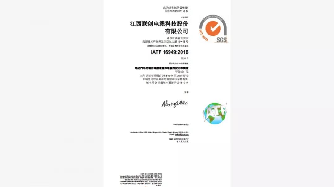 據(jù)了解,為開拓汽車行業(yè)市場,提升企業(yè)管理水平,聯(lián)創(chuàng)科技纜自2017年開始啟動(dòng)IATF16949質(zhì)量管理體系的建設(shè)工作,并于2018年12月14日正式獲得SGS頒發(fā)的IATF16949:2016質(zhì)量管理體系認(rèn)證證書。認(rèn)證范圍為:電動(dòng)汽車充電用連接裝置和電纜的設(shè)計(jì)和制造。